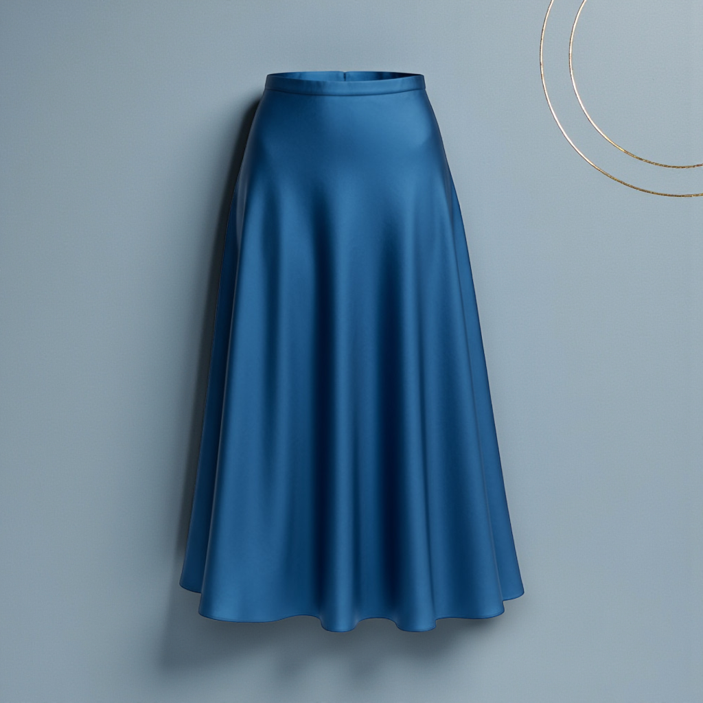 La jupe midi évasée en satin fluide de couleur bleu profond